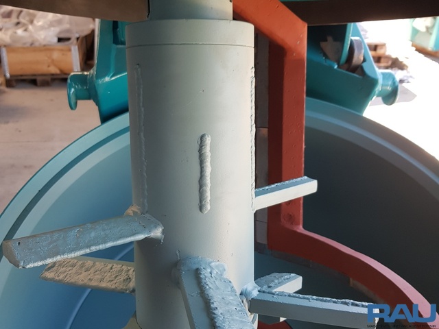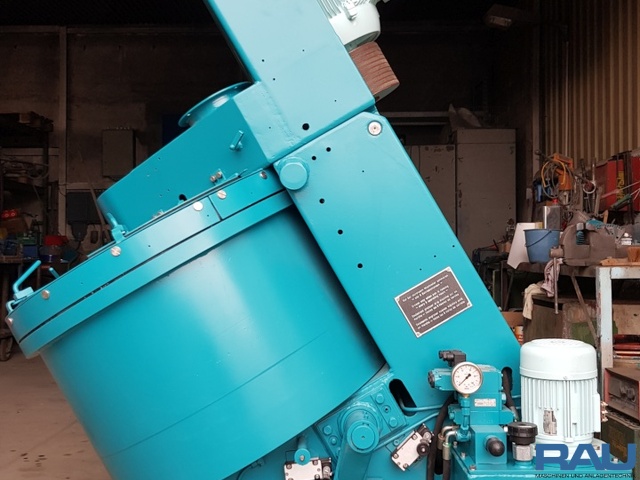 Intensivmischer mit hydraulisch ausklappbarer Werkzeugbrücke, Nutzfüllung pro Charge (max.): 75 l. / 120 kg, Entleerung über zentrale Bodenenklappe (hydraulisch betätigt), Werkzeuge: Sternwirbler und Wand-Boden-Abstreifer.